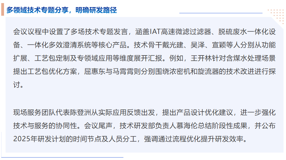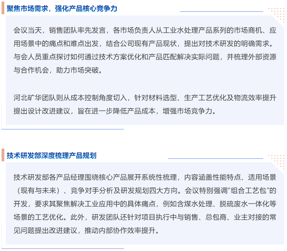 會(huì)議圍繞工業(yè)水處理領(lǐng)域的技術(shù)創(chuàng)新、產(chǎn)品優(yōu)化及市場(chǎng)戰(zhàn)略展開(kāi)深度探討,旨在明確未來(lái)研發(fā)方向,提升產(chǎn)品競(jìng)爭(zhēng)力,推動(dòng)細(xì)分市場(chǎng)拓展。